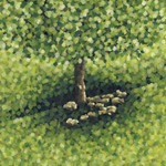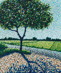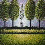 2016Tijdens een zomeravondwandeling raakte ik geboeid door een bosje op het bedrijfsterrein van Johnson Wax in Mijdrecht (bekend van de ‘boemerang boven de vijver’). Het was vooral het hoogpolige witte tapijt van (waarschijnlijk) Fluitekruid waar de bomen in stonden wat me aantrok. Er was wel een hek dat mij scheidde van het bosje, maar dat weerhoudt mij er natuurlijk niet van om er mooi schilderij van te maken! Het werk is contrastrijk, maar ook zeer kleurrijk. Maar daarvoor moet je het eigenlijk in het echt zien.