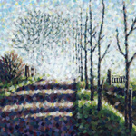 2019Een wandeling op één van de landgoederen van ’s-Graveland was de inspiratiebron voor dit schilderij. Het contrast tussen licht (in de verte) en donker (door de schaduw van bomen) sprak tot de verbeelding.