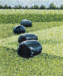 2014Ik prijs me gelukkig met zo’n uitzicht. Hoelang het nog duurt zal de tijd leren, maar het is heerlijk om zo ver weg te kunnen kijken en te zien wat er elk seizoen verandert. In de zomer betekent het in elk geval dat het hoog gegroeide gras weer gemaaid wordt en – eenmaal goed gedroogd in de zon – gehooid wordt. Tegenwoordig ligt het dan nog enige tijd verpakt in landbouwplastic op het land. Dat ziet er altijd een beetje vreemd uit. Die enorme zwarte glimmende keutels, uitgepoept door de landbouwmachines van de boer...